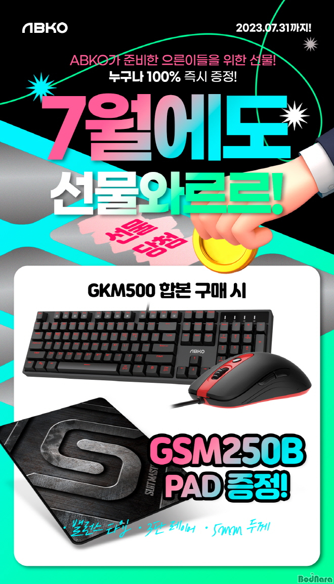 7월 31일까지 진행되는 이번 행사를 통해 ‘N620’이나 ‘GKM500’을 구매할 경우 앱코의 GSM-250B 수트마스터 게이밍 마우스패드(이하 GSM-250B)를 1:1로 증정한다.